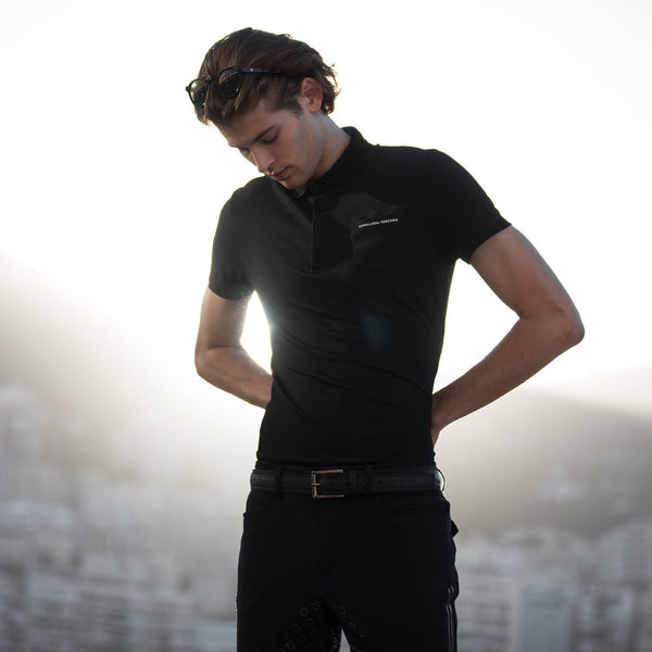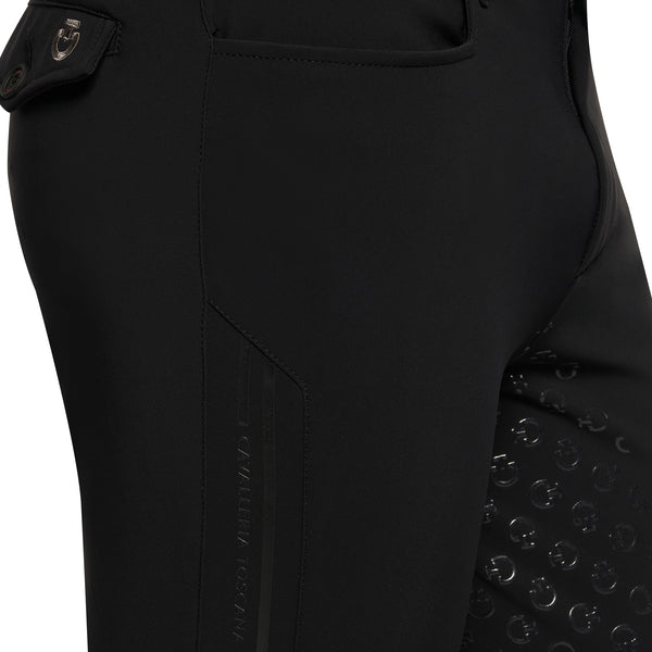 The men's breeches are made of technical piqué that maintains muscles during performance and benefits recovery. The fabric adheres perfectly to the body, follows your movements without restrictions and offers great comfort and breathability. The material provides UV protection during outdoor activity and is extremely durable for frequent use and washing. The breeches feature a transparent knee grip, two front pockets and two back pockets with flaps and a button closure. They are refined with a perforated logo band on the thigh. The Stetch knit socks are refined with a small logo.